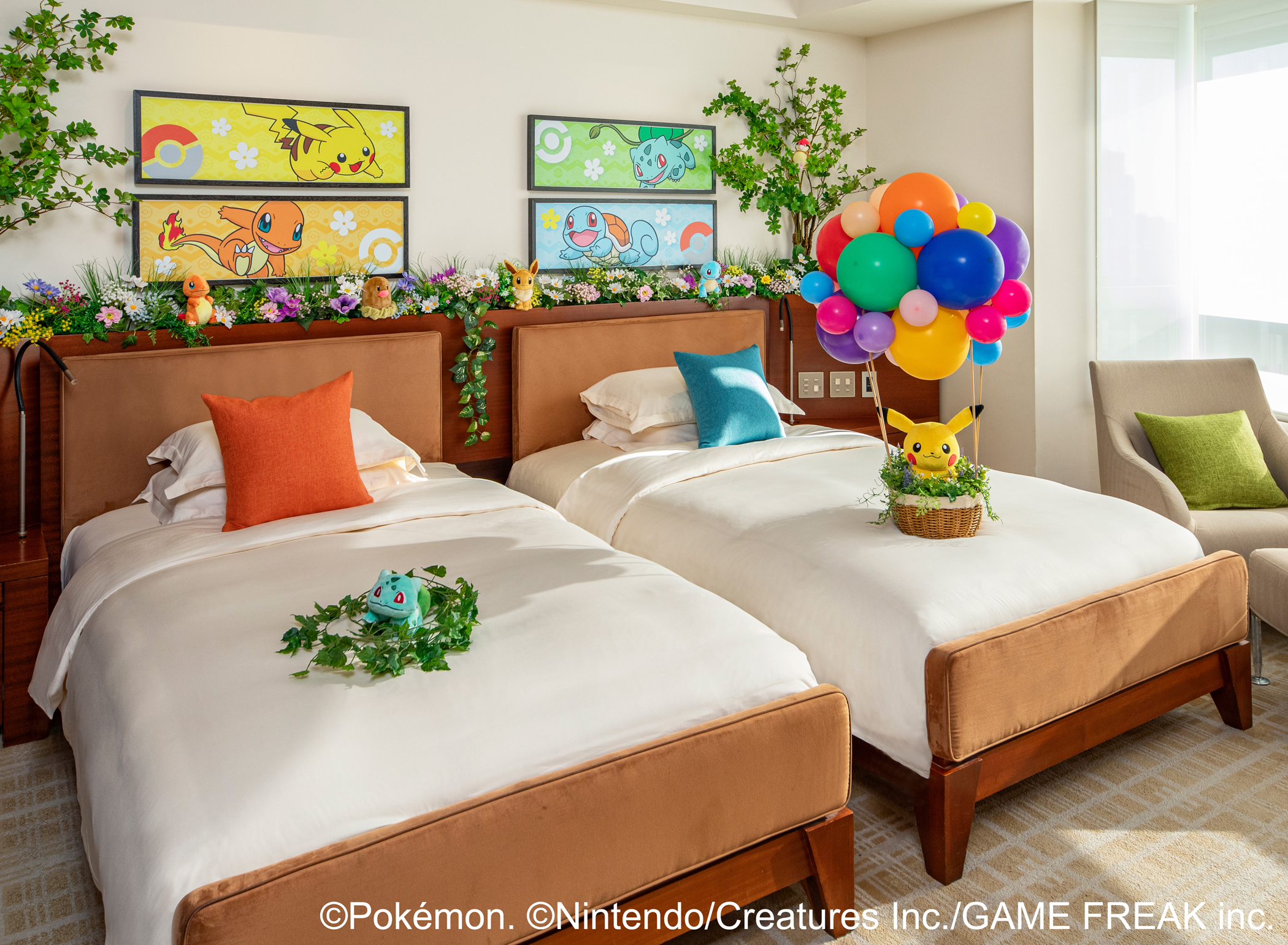 このコラボレーションでは、1日1室限定のスイートルームと、8室限定のスタンダードルームの計9部屋が、ポケモンをデザインした客室に変わります。グリーンや花々を基調とした装飾に加え、『ポケットモンスター 赤・緑』から活躍しているポケモンのアートやデコレーションを客室の随所に散りばめ、まるでポケモンたちとともに冒険しているかのような世界観を演出。すべての客室には、風船で冒険に出るピカチュウをはじめ、ポケモンたちとの冒険を体感できる装飾を施し、思わず写真に撮りたくなるデザインに仕上げます。