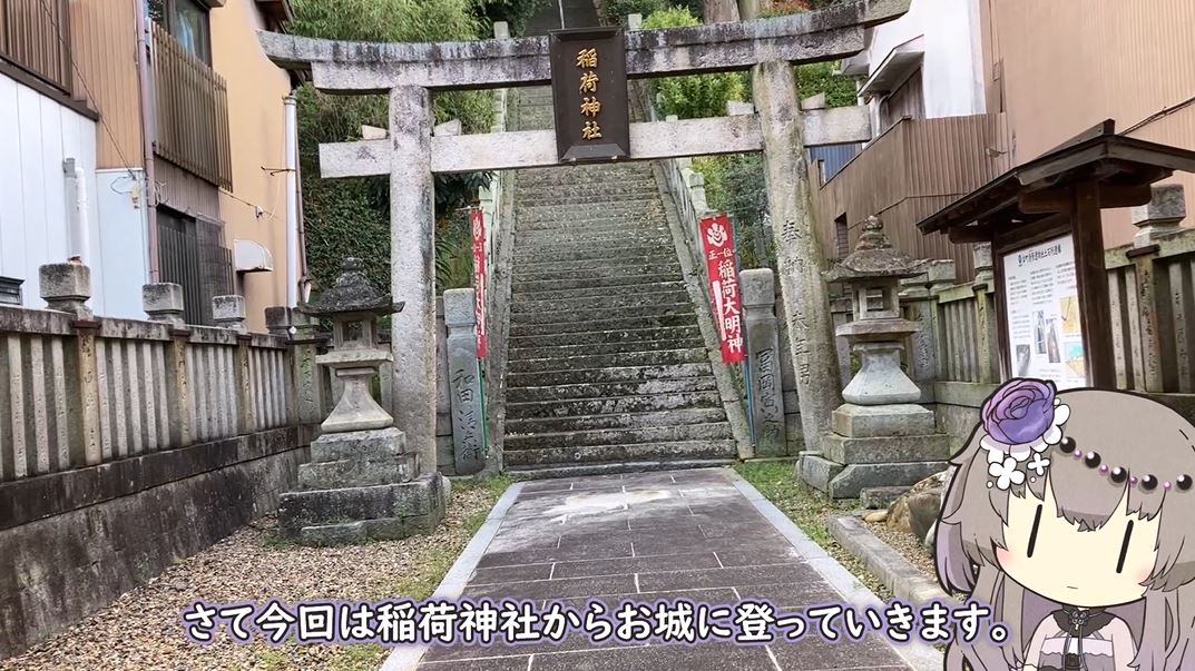 日曜の朝8時なためか、誰もいない商店街の左手にある稲荷神社。ここからお城に登るそうです。