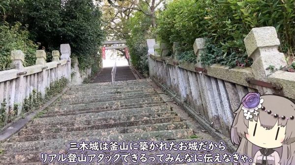 三木城は別名・釜山(ぶざん)城とも呼ばれる平山城。標高差15メートル以上を一直線の階段で登るのはリアル登山アタック要素がありました。
