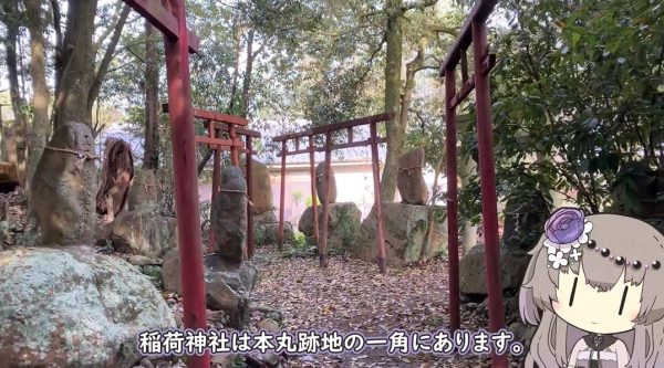 稲荷神社は本丸跡地の一角にあり、裏手には伏見稲荷のお塚を思わせるような石碑が並んでいます。