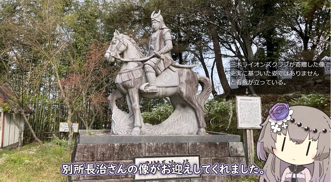 鳥居を抜けて広場へ出ると、別所長治の像がお迎え。別所氏として最後の三木城主であった人物です。2年にわたり羽柴秀吉の苛烈な兵糧攻めに耐えましたが、最後は家臣・領民の命を救うことを条件に自害しました。享年23歳と伝わっています。