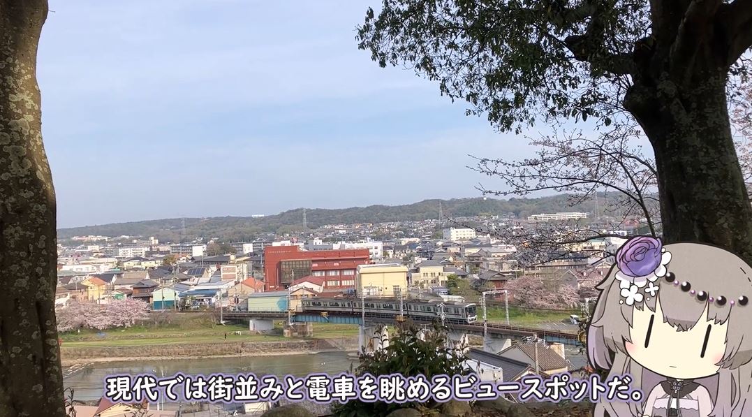 天守台は非常に見晴らしが良く、今では街並みと電車を眺めるビュースポットでした。川が流れていて防衛に適した地形と思ったそう。
