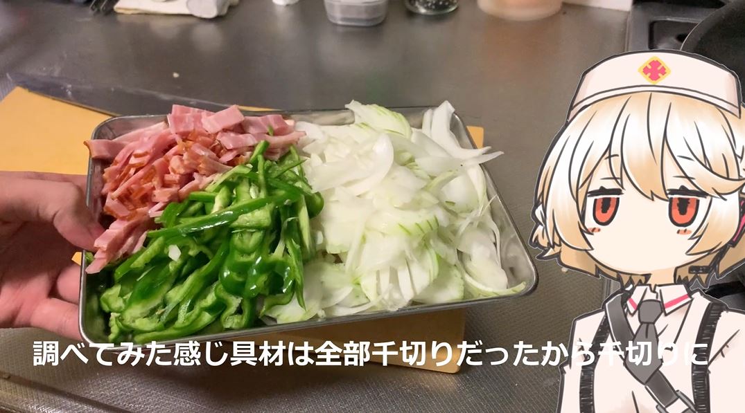 まずは具材をカット。玉ネギとピーマンとベーコンを細切りにしました。