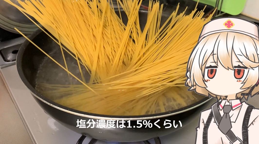 次にパスタを茹でます。塩分濃度はおよそ1.5%です。