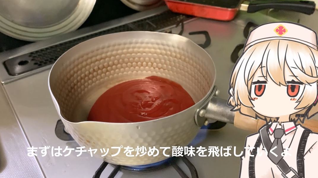 続いてソース作り。まずはケチャップを炒めて酸味を飛ばします。