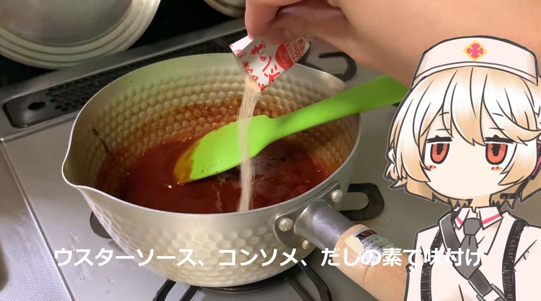 ケチャップを炒め終わったらウスターソース、コンソメ、だしの素で味付け。混ざったら水分(ゆで汁と水)を入れて煮込み、ニンニク少々を加えて水溶き片栗粉でとろみをつけます。黒コショウを沢山かけたらソースのできあがりです。