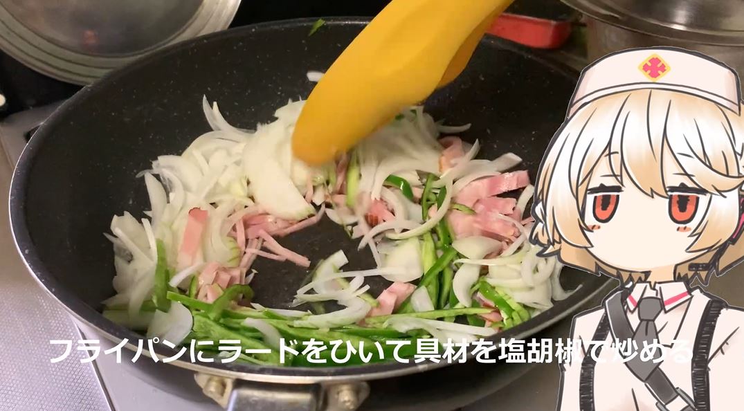 次は炒め工程。フライパンにラードを引いて具材を塩コショウで炒めます。好みによりますが、少し食感が残るくらいがいいとかわうそさん。