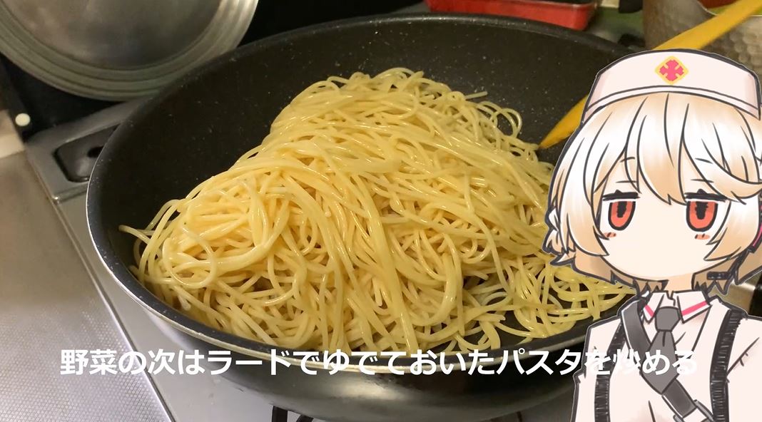 野菜の次は同じくラードでパスタを炒めました。