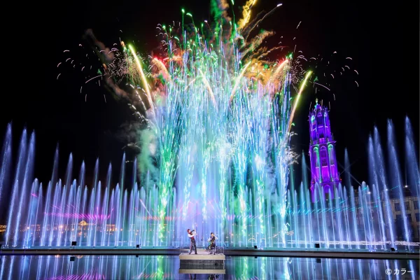19時30分ごろ、こだわりが詰まった光の演出や最大高さ20mを誇る迫力の噴水とドムトールンのライティングとのコラボレーションと、『エヴァンゲリオン』の劇中に使用されているクラシック音楽をテーマにした光絶景エンターテインメントが一面に広がりました。